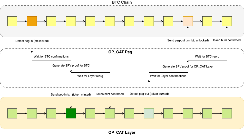 The diagram illustrates the complete process of transferring funds between Bitcoin and the OP_CAT Layer through the trustless two-way OP_CAT Peg implemented with SPV proofs.