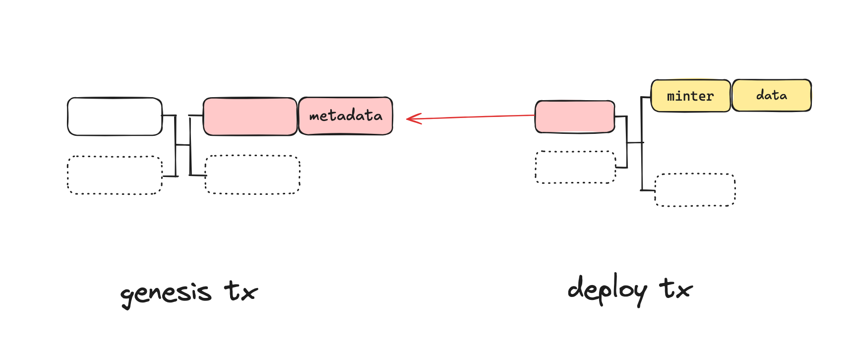 To deploy a cat721 token, we need send 2 transactions. We call the first transaction the cat721 token genesis transaction, and the second the deploy transaction. In the data field of the an output of the genesis transaction, we include a CAT envelope to embed cat721 token meta information.