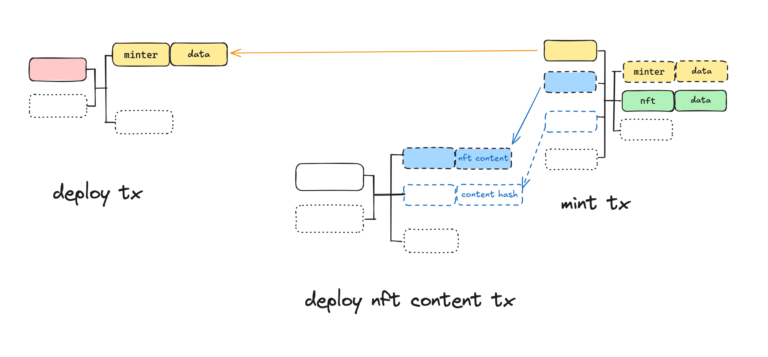 Before minting an NFT, the contentType, contentBody, and metadata of the NFT must first be deployed. Find a minter UTXO, unlock it. Unlocking the minter will create a cat721 token UTXO, thereby completing the token minting.