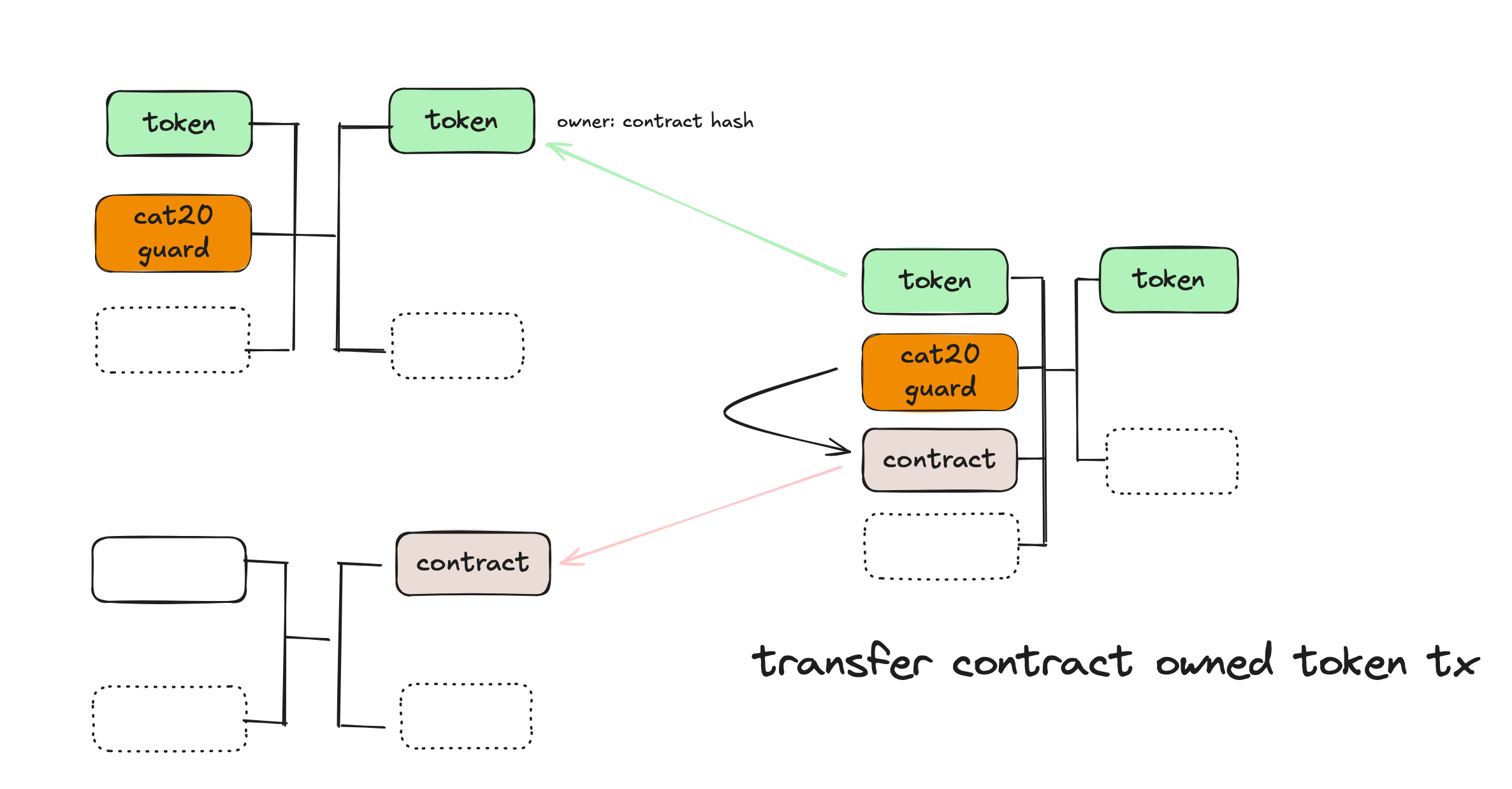 Tokens can be deposited to a contract hash. It is not controlled by anyone but the contract, since there is no corresponding private key. This is similar to a smart contract account in Ethereum, which also does not have a corresponding private key, unlike an Externally Owned Account (EOA). To transfer the tokens, the CAT token contract ensures there must be a neighboring input in the same transaction, spending a UTXO with the owner contract address (shown by the red arrow). The contract can inspect and place constraints on the transaction using covenant, thus enforce additional transfer rules.
